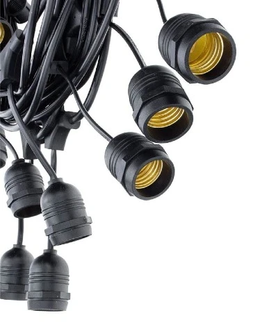 Oświetlenie zewnętrzne z 20 oprawkami do żarówek z dużym gwintem E27 nie przekraczających mocy P=40W (każda z nich). Wykonana w kolorze czarnym. Posiada wtyczkę UE, wodoodporne gniazda oraz gumowe zabezpieczenie zewnętrzne o stopniu ochrony IP44. Łańcuch świetlny 20 m można łączyć w dowolne długości i łatwo przedłużać poprzez odpowiednie gniazda, nie przekraczając przy tym mocy 1100W.